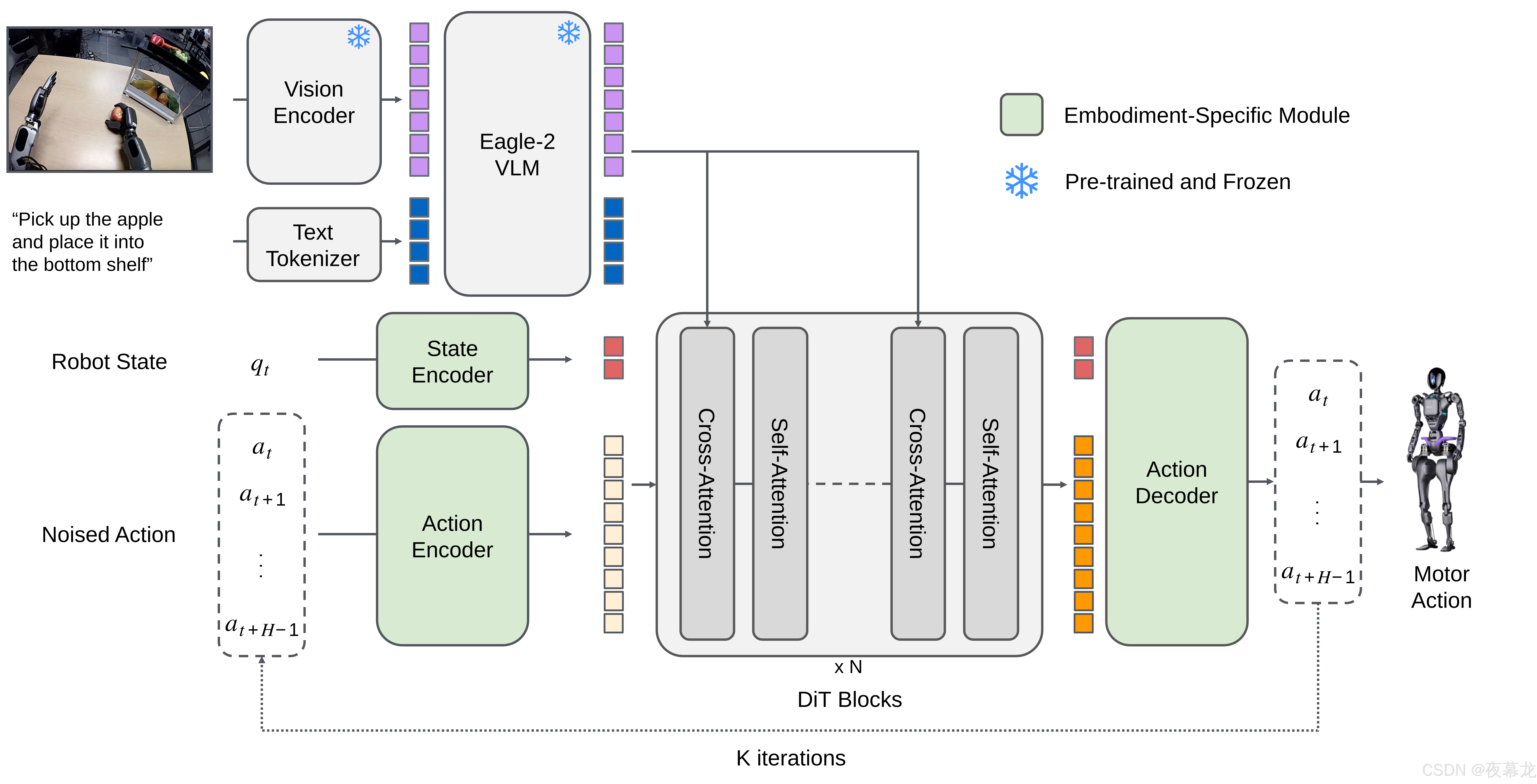 与 N1 一样,GR00T N1.5 使用 NVIDIA Eagle VLM 对文本和视觉观察结果进行编码。然后,视觉语言嵌入通过 VLM 生成,再由 DiT 进行交叉注意力处理,DiT 处理状态和添加噪声的动作