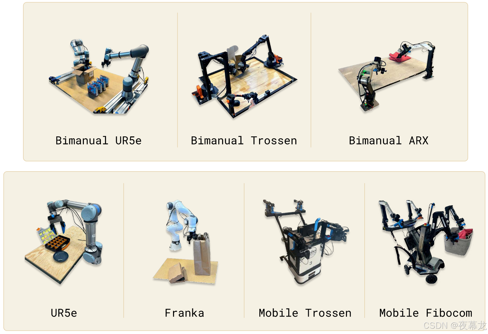 - 为了让模型兼容多种机器人平台的数据,采用跨具身体训练(Open X-Embodiment),将多种机器人(单臂、双臂、移动底盘等)数据统一进同一模型