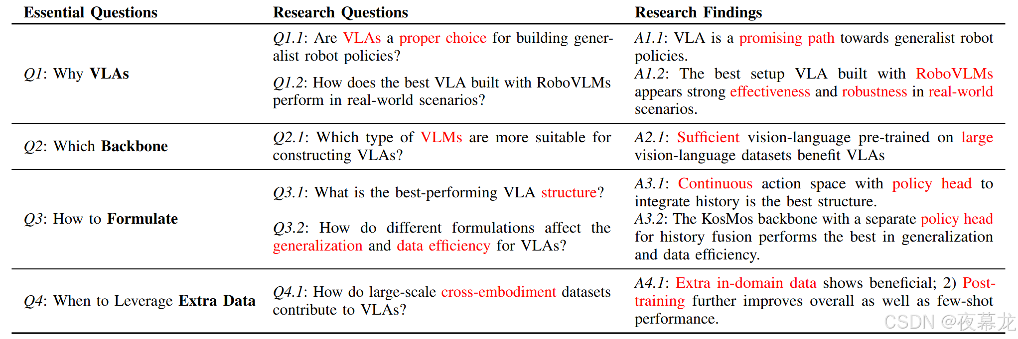 1. 虽然 LLM 和 VLM 表现出了广泛的指令理解和问题求解能力,但它们不像人类那样真正“嵌入”在物理世界中,它们对物理交互的理解完全基于抽象描述。如果要让这些方法在实现人类级物理环境适应性方面取得实质性进展,就需要用“具身机器人 agent”的物理数据来训练它们