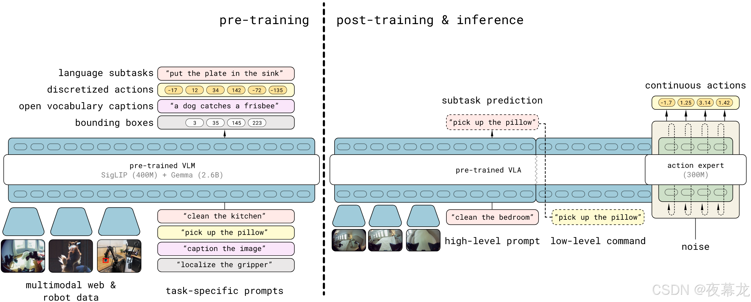 - 如同语言模型一样,架构只是方法的一部分。要实现复杂任务的灵活与鲁棒,还需合理的训练流程。采用类似于超大规模语言/视觉-语言模型的“预训练/后训练”分离策略,先用大规模多样数据预训练,再用更小且高质量的数据微调,实现所需的灵巧、效率和鲁棒