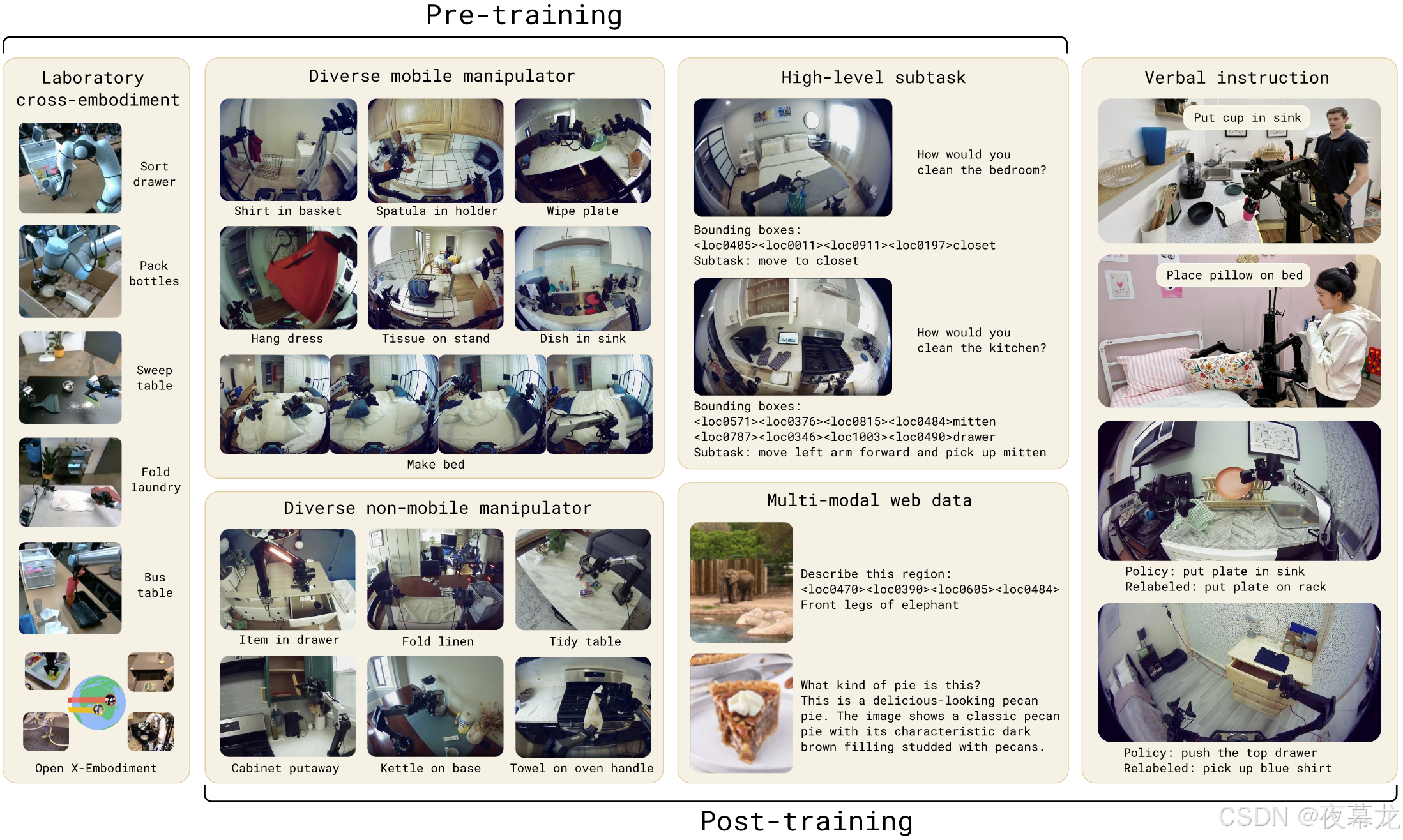 - 本论文的目标之一是研究复杂灵巧行为,因此采用了超大规模数据集,包含约1万小时示范,并辅以开放数据OXE[10]。证明了类 LLM 的“预训练/后训练”recipe 能极大提升模型效果:预训练给予模型宽泛知识基底,后训练用高质量数据精调出目标行为