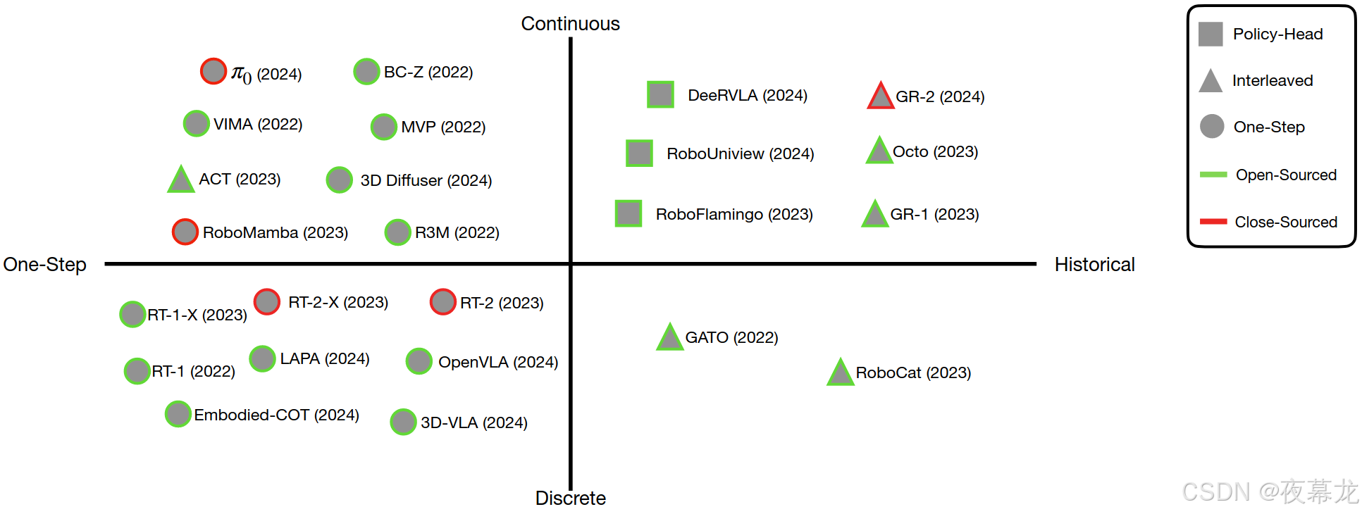 - 此前的 VLA 模型多采用自回归的离散化方法,将动作表示为类似文本 token 的序列。而本论文采用了新颖的方式,将 VLM 微调为可通过流匹配(flow matching,一种扩散变体[32, 28, 20, 46])直接生成动作。像Zhou等人[59],本文用diffusion-style(flow matching)loss在序列每一元素上训练模型,而不是传统decoder-only transformer的交叉熵loss;又如Liu等人[29],为扩散相关token设计独立参数