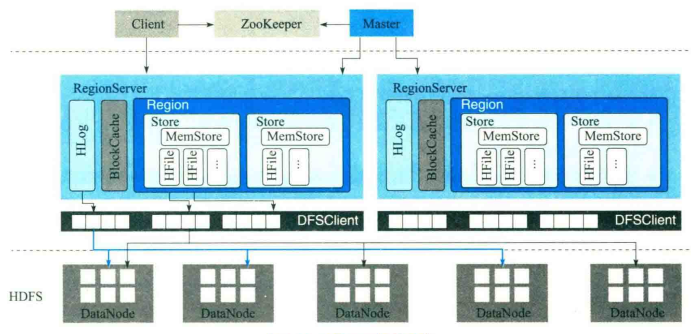 - 第五是HDFS。Hbase中所有数据都存储在HDFS中,包括用户数据文件、Hlog日志文件。Hbase会通过封装好的DFSClient,来对HDFS的实际数据进行读写访问。