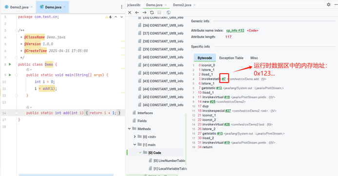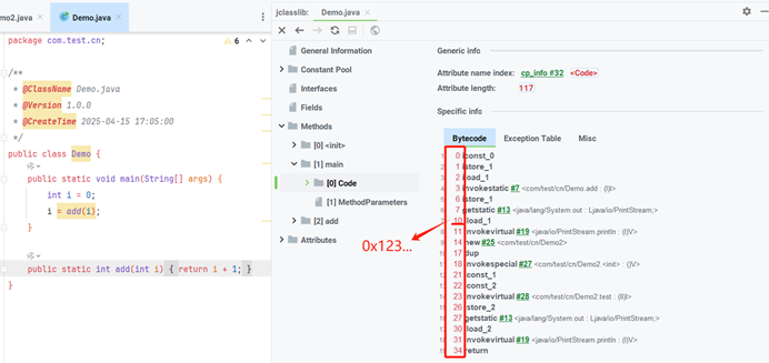类加载器将字节码加载到内存后,会将原文件中的偏移量转换成内存地址。每一条字节码指令都会拥有一个内存地址。代码执行时,程序计数器会记录下一行字节码指令的地址。
