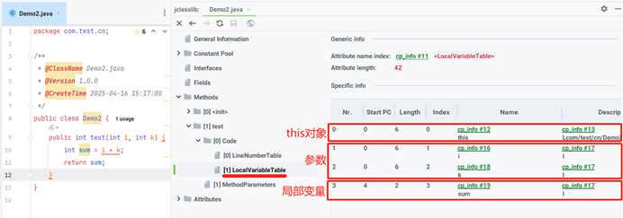 局部变量表中保存了实例方法的this对象,方法参数,局部变量。