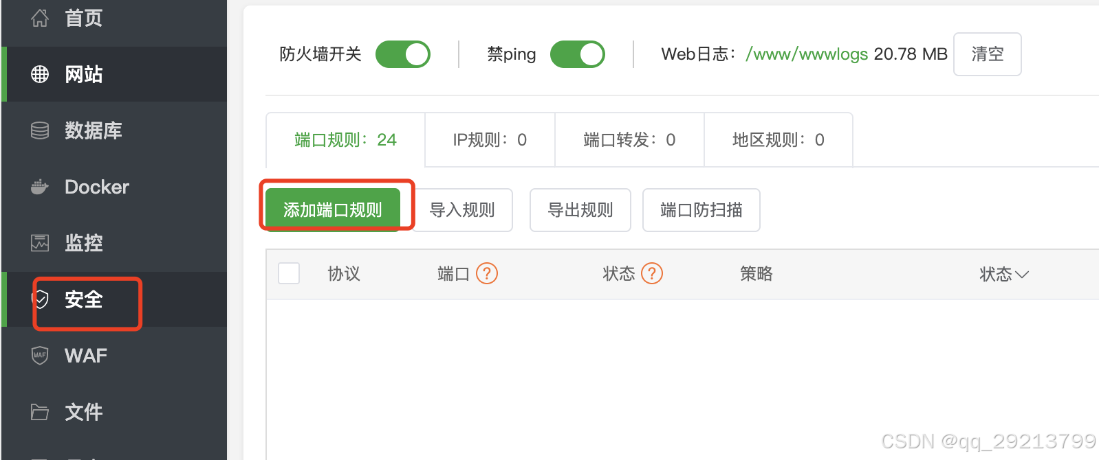 如果宝塔服务是部署在云服务器上的话,那么还要打开相关云服务器端口的安全策略