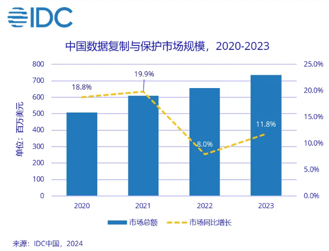 国际数据公司 IDC 发布了《中国数据备份与恢复系统市场季度跟踪报告(2023年)》,数据显示,中国 DR&P 市场在2023年达到7.3亿美元的收入,同比去年同期增长了11.8%,展现出健康的增长势头。