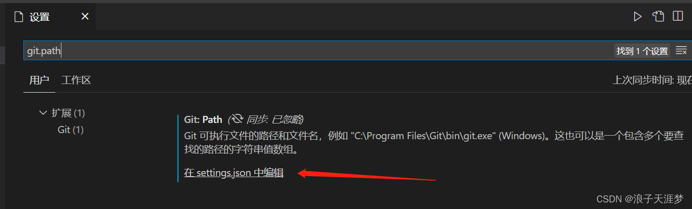 然后打开vscode,打开设置,搜索git.path,然后点击在setting.json中编辑