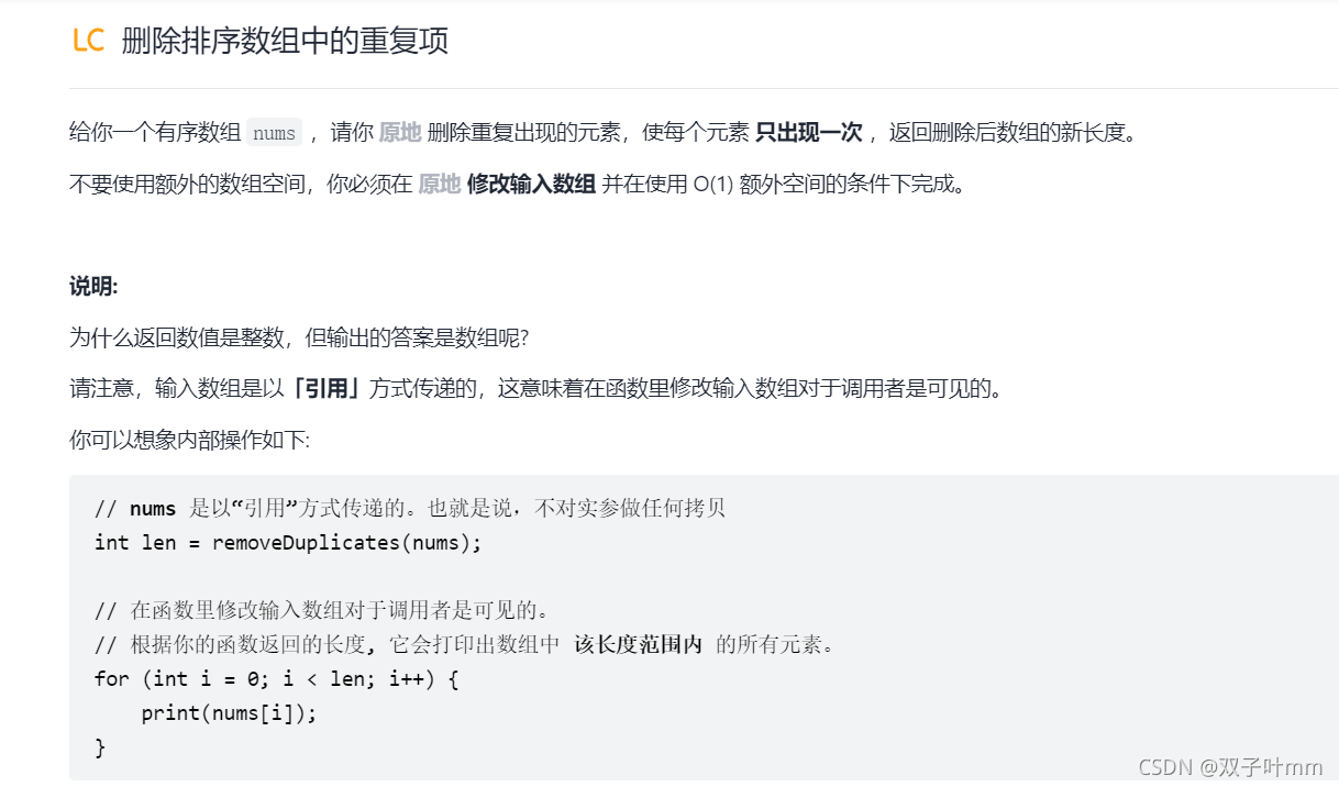 由于题目要求在有序数字nums上原地操作,所以无法采用创建新的列表去遍历原列表的元素的方法,这里的解题方法用到的是双指针法。