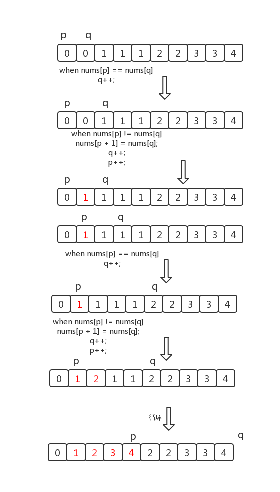 直到找到和p不一样的,则p往前走,然后把p位置放q的值,然后q再往前走。