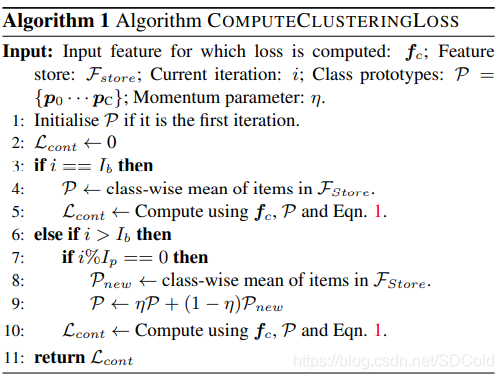 在隐藏层特征空间上类的区分性将是实现类别分离的理想特征。采用对比性聚类就是为了强制性的达到图1上最后一行中间图的效果,类内差尽量小,而类间差尽量大。每个已知类别会维护一个向量 是检测器中间层生成的特征向量,假设已知类别数为 ,则特征向量表征为 ,其中 代表未知类的特征向量。然后再建立一个 用来存储训练过程中的临时特征向量,每个类的特征向量存在其对应位置。最后在常规损失函数上再叠加一个对比聚类损失来达到强制降低类内差,增大类间差的效果。原文中该部分的流程图如下,其中 是不叠加对比聚类损失的轮数,用以初始化已知类别的特征向量, 表示,在迭代轮数大于 后,每轮都计算对比聚类的损失,并每 轮进行一次特征向量更新(有点像混合高斯背景建模了):