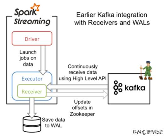 - 在executor上会有receiver从kafka接收数据并存储在Spark executor中,在到了batch时间后触发job去处理接收到的数据,1个receiver占用1个core使用wal预写机制,因为需要使用hdfs等存储,因此会降低性能。