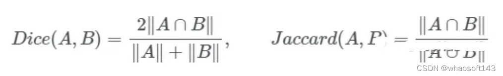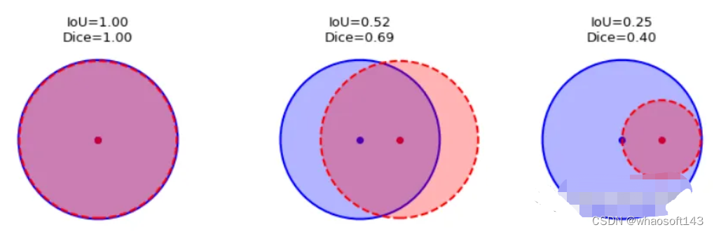 这一目标的两个相关但不同的指标是Dice和Intersection / Union (IoU)系数,后者也被称为Jaccard系数。两个指标都在0(无重叠)和1(完全重叠)之间。