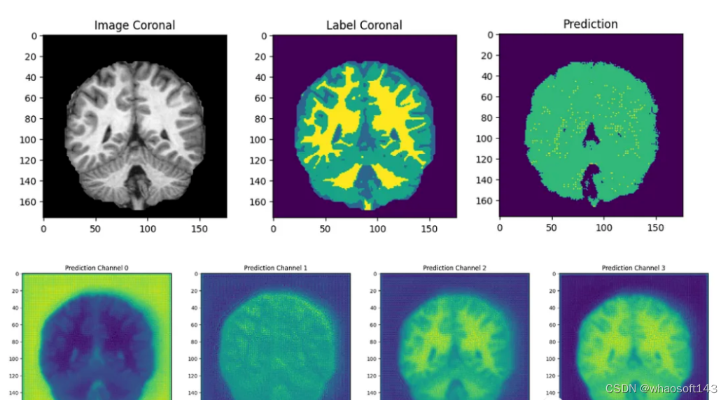 最后我们要看看模型是如何推广到未知数据的这个模型预测的几乎所有东西都是左脑白质,一些像素是左脑皮层。尽管它的预测似乎是正确的,但仍有很大的改进空间,因为我们的模型太小了,可以选择更深的模型获得更好的效果。