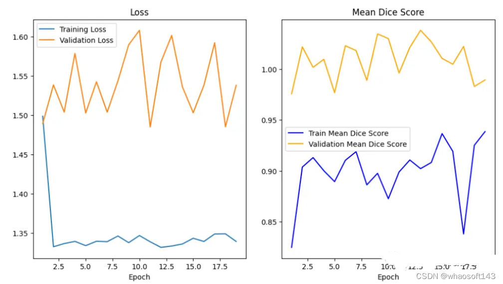 我们可以看到Dice得分曲线的行为相当不寻常。主要是因为验证平均Dice得分高于1,这是不可能的,因为这个度量是在0和1之间。我们无法确定这种行为的主要原因,但我们建议在多类问题中为每个类单独提供度量计算,并始终提供可视化示例以进行可视化评估。