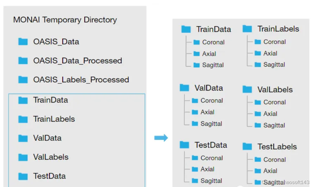 因为模型需要的是二维切片,所以将每个切片保存在不同的文件夹中,如下图所示。这两个代码单元将训练集的每个MRI体积的切片保存为“.png”格式。