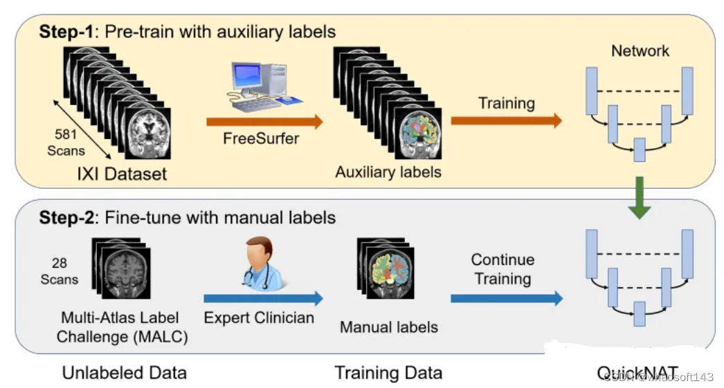 首先,使用现有的软件工具(例如FreeSurfer)从大型未标记数据集中获得自动生成的分割,然后使用这些工具对网络进行预训练。在第二步中,使用更小的手动注释数据[2]对网络进行微调。