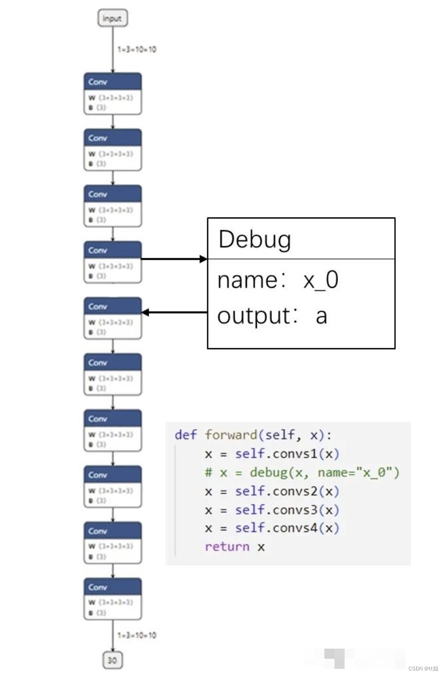 我们可以为原模型新写一个 forward 函数。在这个新的函数函数中,我们可以通过 debugger.debug 把每一个输出张量标记起来,并各取一个不重复的调试名。