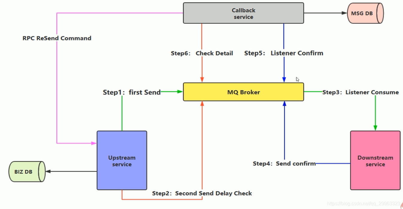 step6:Callback service(回调服务)会监听step2发送的延时消息,受到消息后,去MSG DB(消息库)查询,若查到了,则消息顺利完成投递。若查询不到,则在回调服务中在放松一个RPC请求,到Upstream service(上游服务),在进行消息投递。