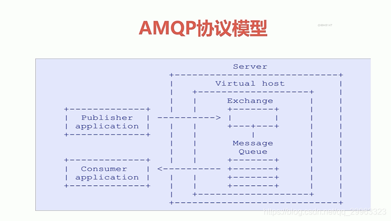 该模型图借鉴于慕课网讲rabbitMQ课程里面的图。讲讲我对AMQP协议模型的理解。 Publisher application相当于生产者,生产者生产的消息会发送给broker,也可以叫server。我们可以看到右边是层级的关系。消息先到server,再到Virtual host(虚拟地址),用于进行逻辑的隔离,最上层的消息路由。一个Virtual host里面可以有若干个exchange和queue,但是不能有相同名称的exchange和queue,最后到达exchange(交换机)。Consumer application相当于消费者,他会读取Message Queue(队列)中的数据。但是现在数据在exchange(交换机)中,所以exchange(交换机)和queue(队列)需要建立绑定的关系,这样消费者就能通过队列拿到消息了。还有一个核心的名词,connection(链接),每次都要创建链接,channel(通道),message(消息体),routing key(路由key)。