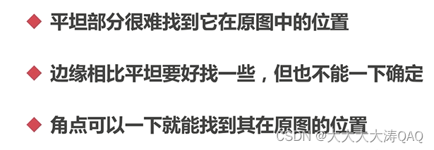 ② 拼图游戏,将图片拆分,进行分类查找特征;方法是:寻找特征点,特征是唯一的,可追踪的,能比较的;