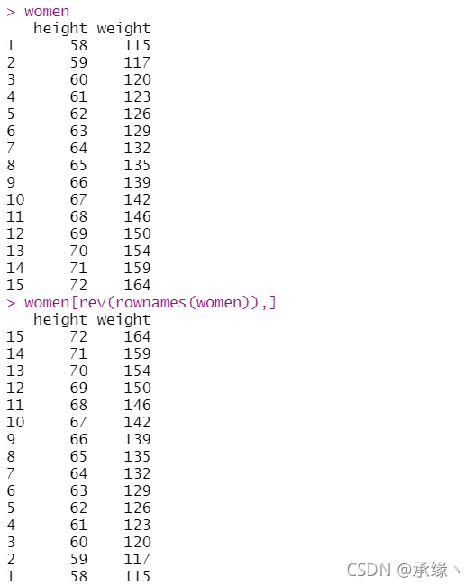 反向一行数据:rev(),数据框每行数据翻转则women[rev(rownames(women)),]