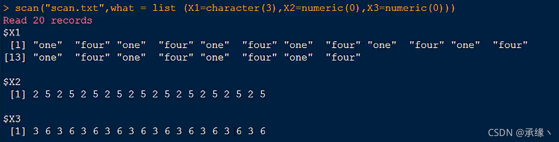 scan("scan.txt",what = list(x1 = character(3),x2 = numeric(0),x3 = numeric(0)))