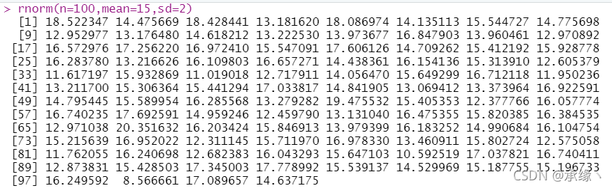 rnorm:正态分布的随机数函数,例如生成均值为15,方差为2的100个随机数: