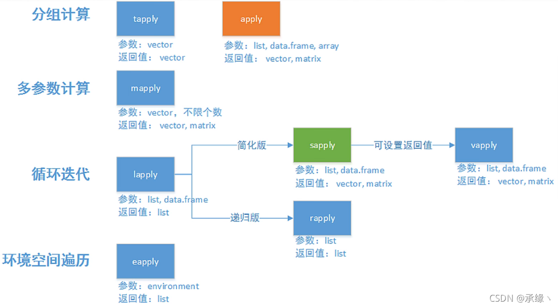 apply适用于数据框或矩阵,参数MARGIN的1代表对行进行处理,2代表对列进行处理。