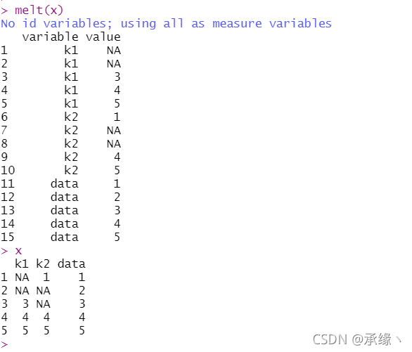 melt函数指定id列:melt(airquality,id.vars = c("month","day"))