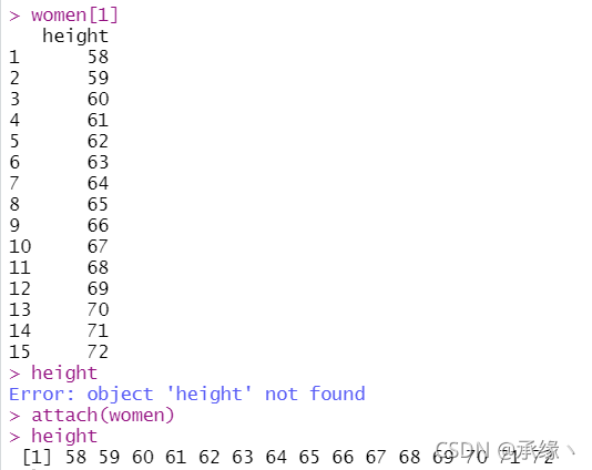 attach()函数将数据框加载到当前的搜索目录中,加载完之后可以直接通过列名访问: