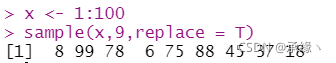 sample()随机抽样,replace参数默认是true,每个数字返回一次: