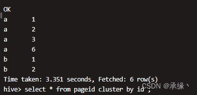 cluster by 除了具有distribute by的功能外,还会对该字段进行排序。当distribute by和sort by 字段相同时,可以使用cluster by 代替。