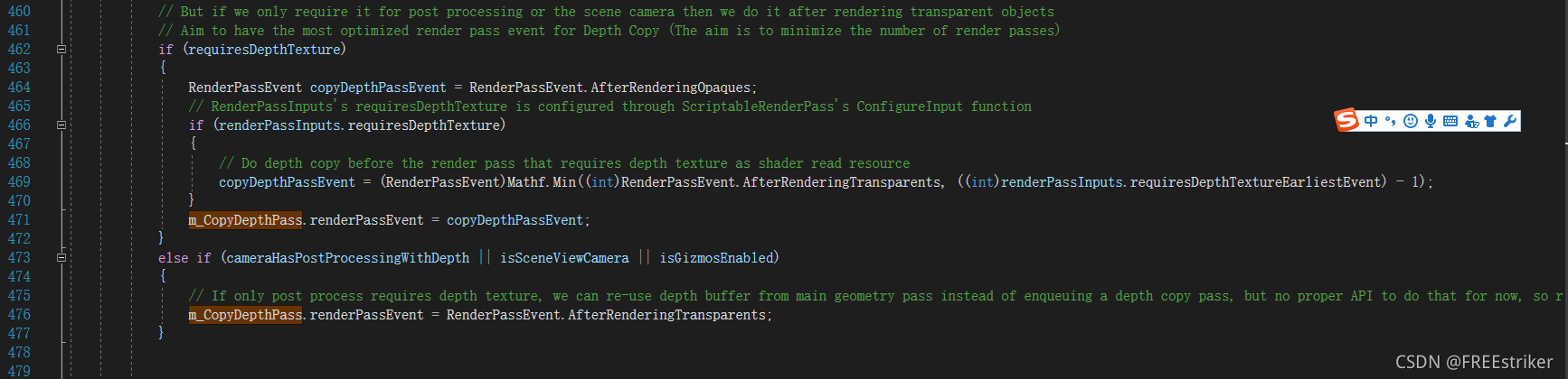 但是真正卡住我的是:虽然Sprite把Mesh的深度写入了,但是PostProcessing使用的”_CameraDepthTexture“并没有获得正确的深度,只包含了不透明物体的深度,在FrameDebgger中也会看到”CopyDepth“的pass在”DrawOpaqueObjects“的pass后就立刻执行了,所以即使前面写入了深度,但在此之前就已经把深度图拷贝出来了,相当于白写了,在我查看了urp的代码后才发现,它会自动计算拷贝深度图的时机: