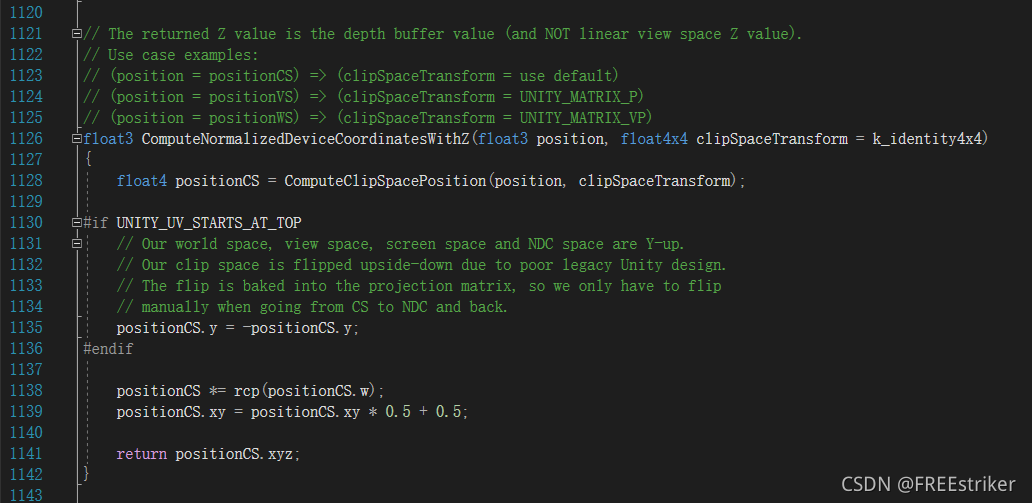 其中的难点是如何计算与写入深度,在看urp的手册的时候,找到有一个官方案例中使用了一个“ComputeNormalizedDeviceCoordinatesWithZ()”函数,在“Packages/com.unity.render-pipelines.core/ShaderLibrary/Common.hlsl”文件中可以找到: