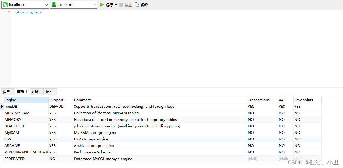 查看comment可以看到,存储引擎为INNODB才能建立外键,一般默认用的是MyISAM引擎,具体修改方式为找到mysql的配置文件,修改。使用查看使用的存储引擎。