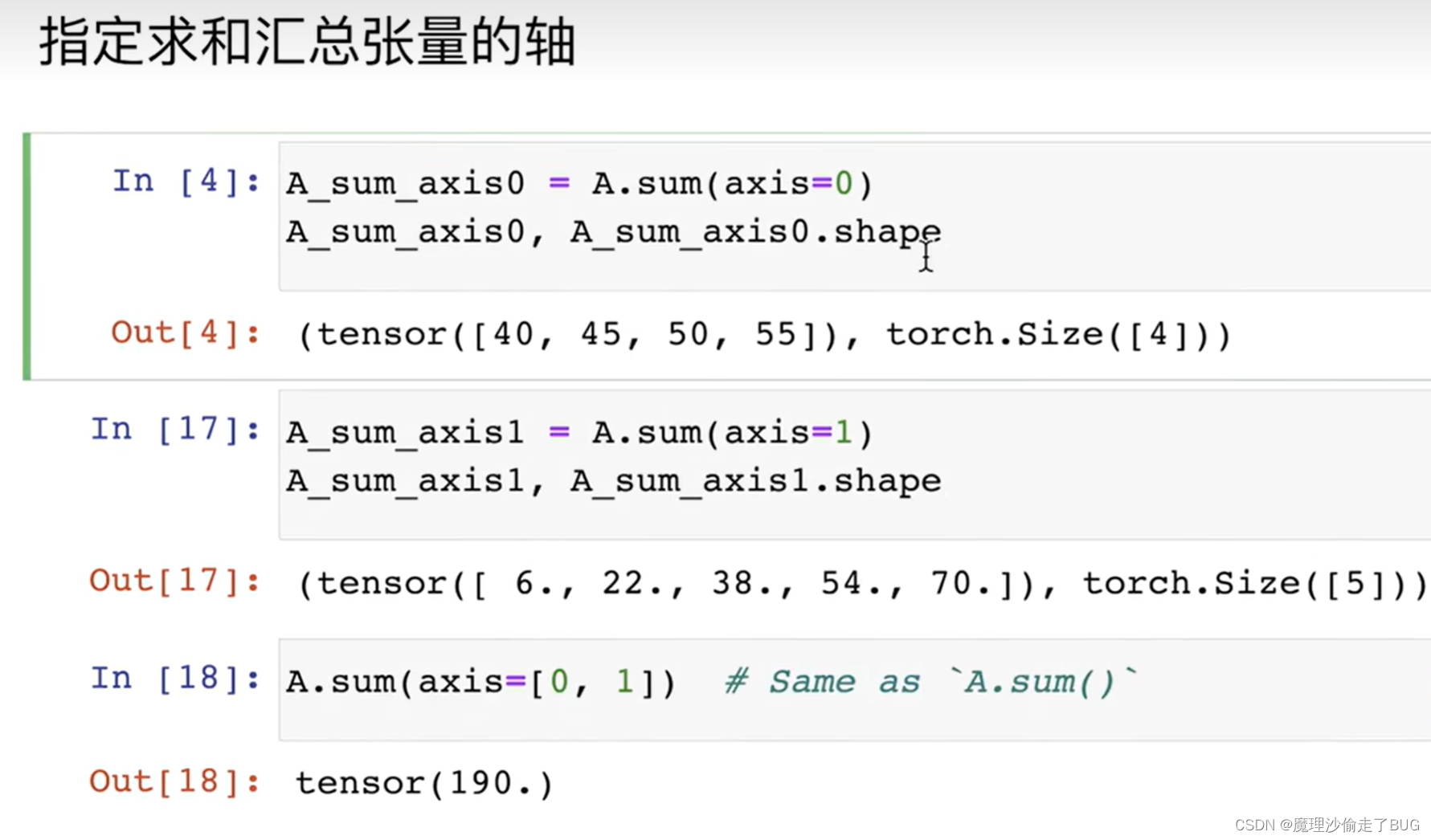 【注】axis是按不同维度求和,从0开始是第1个维度。这里理解上稍微有点难度,我写了代码: