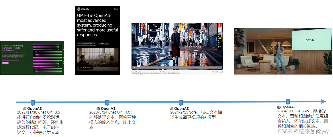 去年3月14日,大洋彼岸的OpenAI正式发布其里程碑之作GPT-4,引起了行业轰动,今年过年期间,大洋彼岸的Open AI又扔出了另一款重磅级的科技产品SORA,代表着继文字生成和图片生成以后,视频生成已经成为可能。而在5月13号Open AI又发布了GPT-4o:能接受文本、音频和图像的任意组合输入,还能生成文本、音频和图像的相关回应。