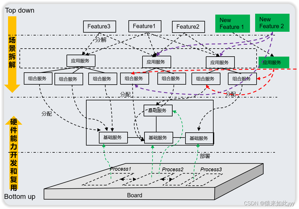 在汽车智能化时代,OTA技术让功能和体验不断更新成为可能,为满足快速频繁迭代的需求,以AUTOSAR为代表的分层式软件架构,将中间RTE(Runtime Environment)作为虚拟功能总线VFB(Virtual Functional Bus)的实现,解耦了上层的应用软件层(Application Layer)与下层的基础软件(Basic Software)的强关联性。并通过SOA服务软件架构,将汽车上一个一个原子化的功能服务化,通过定义良好的接口和协议进行随意编排、组合从而实现不同智能化场景并大大降低了开发周期和成本。