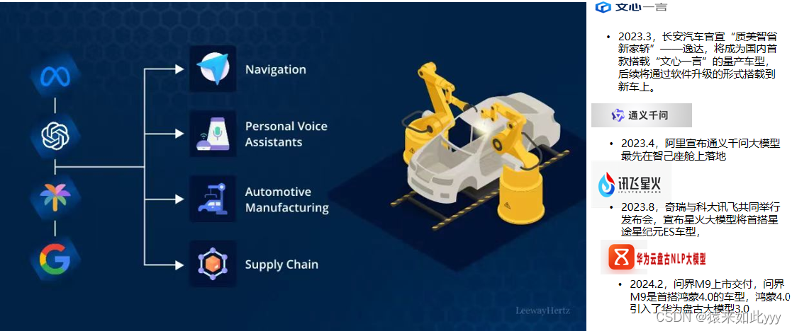 其次,随着以ChatGPT-4为代表的大语言模型成熟,语言大模型在智能座舱语言识别方面应用方兴未艾,去年以来,吉利、长城、红旗、东风日产、岚图等车企宣布与百度文心一言合作,广汽、奇瑞将搭载科大讯飞的星火大模型,华为盘古大模型将上车问界M9,阿里通义千问在智己汽车首秀。在2024年的CES展上,奔驰发布的全新MB.OS车机系统搭载了全新虚拟助理,利用大型语言模型提供更自然的人机对话。