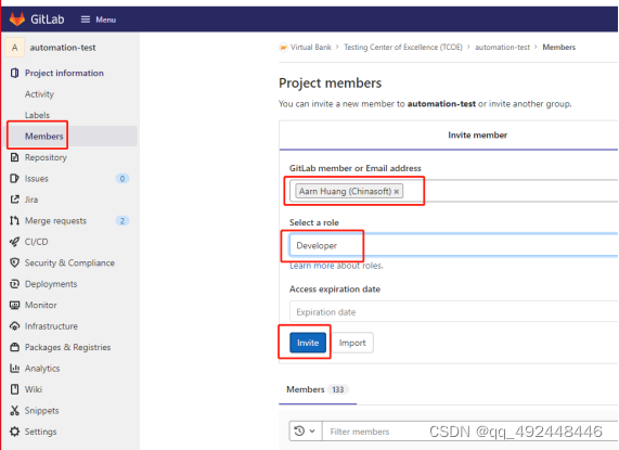 进入项目,在Members中添加人员,并点击Invite,如下图所示: