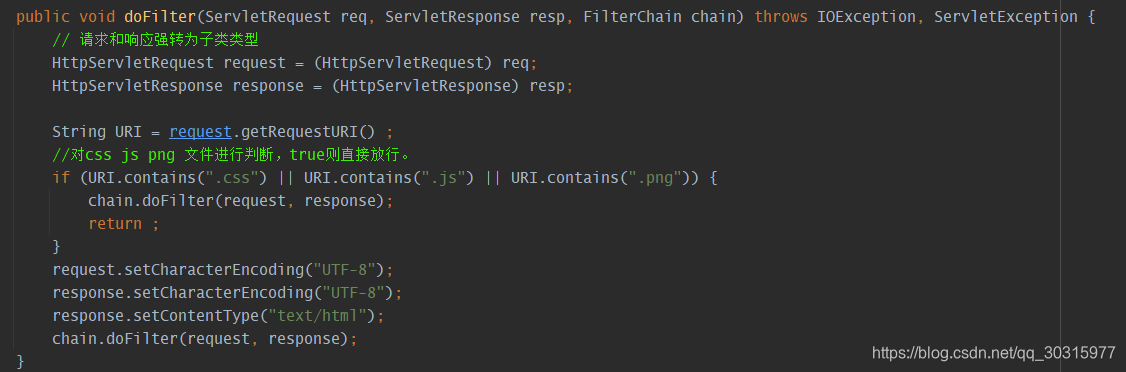 JS中文乱码问题 js在浏览器中显示乱码的根本原因就是编码问题,所以解决了编码问题js基本上可以正常显示。一:利用txt文本另存为设置编码这样js文件就设为utf-8编码了。二:在js的加载代码中添加编码charset="utf-8"三:特殊情况,过滤器,一般过滤器很少过滤.js ,.png,.css,对全路径进行过滤时要对文件判断 public void doFilter(ServletRequest req, ServletResponse resp, FilterChain chain)