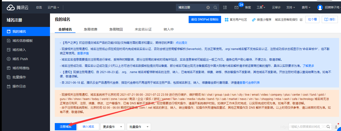 怎么让服务器拥有域名,并且tomcat绑定ssl证书 自己写了一个后端对接微信小程序,小程序需要进行https才能请求并且是域名。所以折腾了两天。一:申请域名我服务器是腾讯云的所以我用的是腾讯云,首先去腾讯云搜索注册域名我们看看腾旭云的域名相关的介绍:注册要实名制,实名制后等待通过后,需要在3天之后备案(不备案不能正常发布使用,但是写接口的时候是可以正常解析的)接下来就去注册你的域名吧。点击注册域名后,可以搜索关键字,然后购买你想要的域名,价格不一样,自行根据条件选择。购买后来到我顶域名就能看到你的域名啦,然...