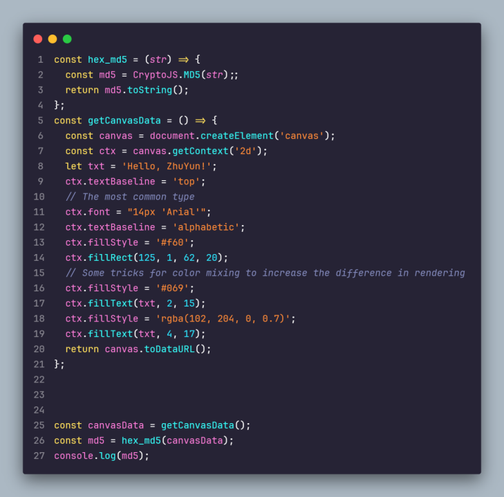 - 用canvas 绘制一个图像,在画布上渲染图像的方式可能因web浏览器、操作系统、图形卡和其他因素而异,从而生成可用于创建指纹的唯一图像。在画布上呈现文本的方式也可能因不同web浏览器和操作系统使用的字体渲染设置和抗锯齿算法而异。