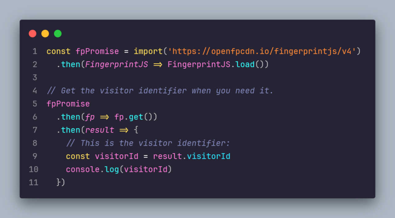 FingerprintJS是一个源代码可用的客户端浏览器指纹库,用于查询浏览器属性并从中计算散列访问者标识符。