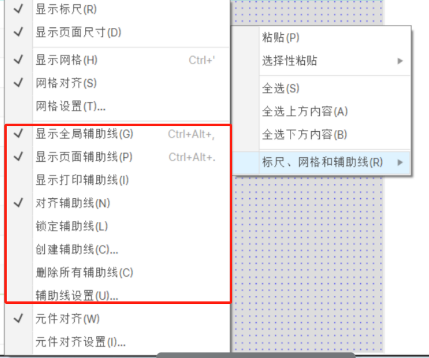 可以在画布空白处单击鼠标右键「标尺、网格和辅助线」把「显示标尺」``「显示全局辅助线」、「显示页面辅助线」都勾上