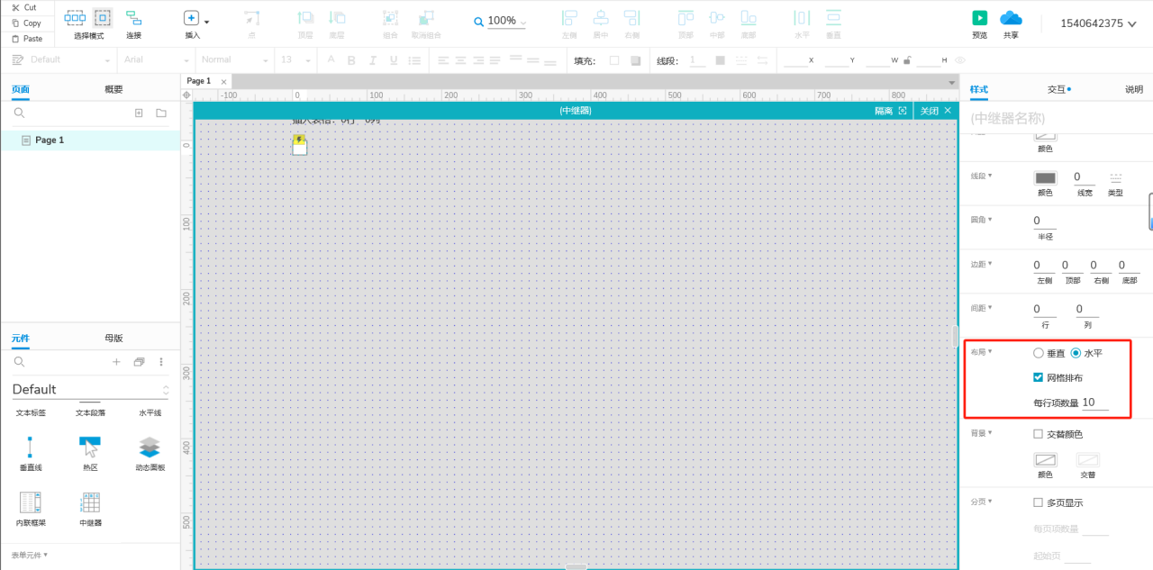 这个交互的用到了中继器,所以首先在工作区拖入一个中继器元件,中继器內放一个矩形,并设置为每行10项水平分布。