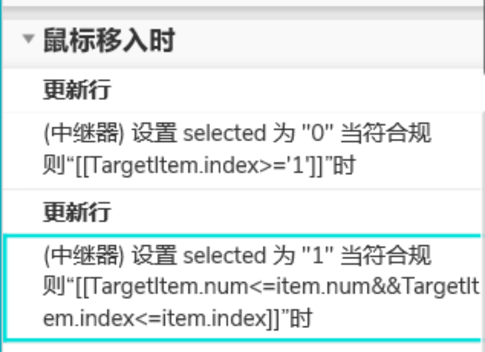 给矩形添加鼠标移入的交互,以上述条件作为规则修改中继器 selected 的值