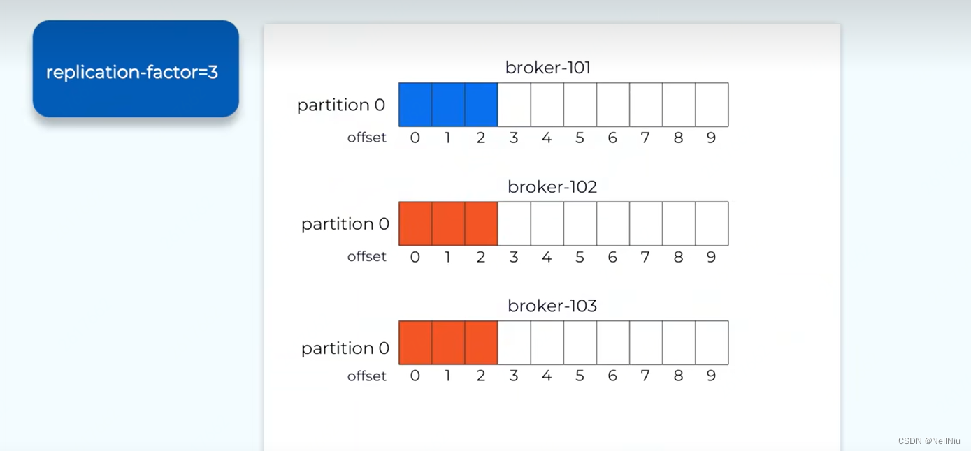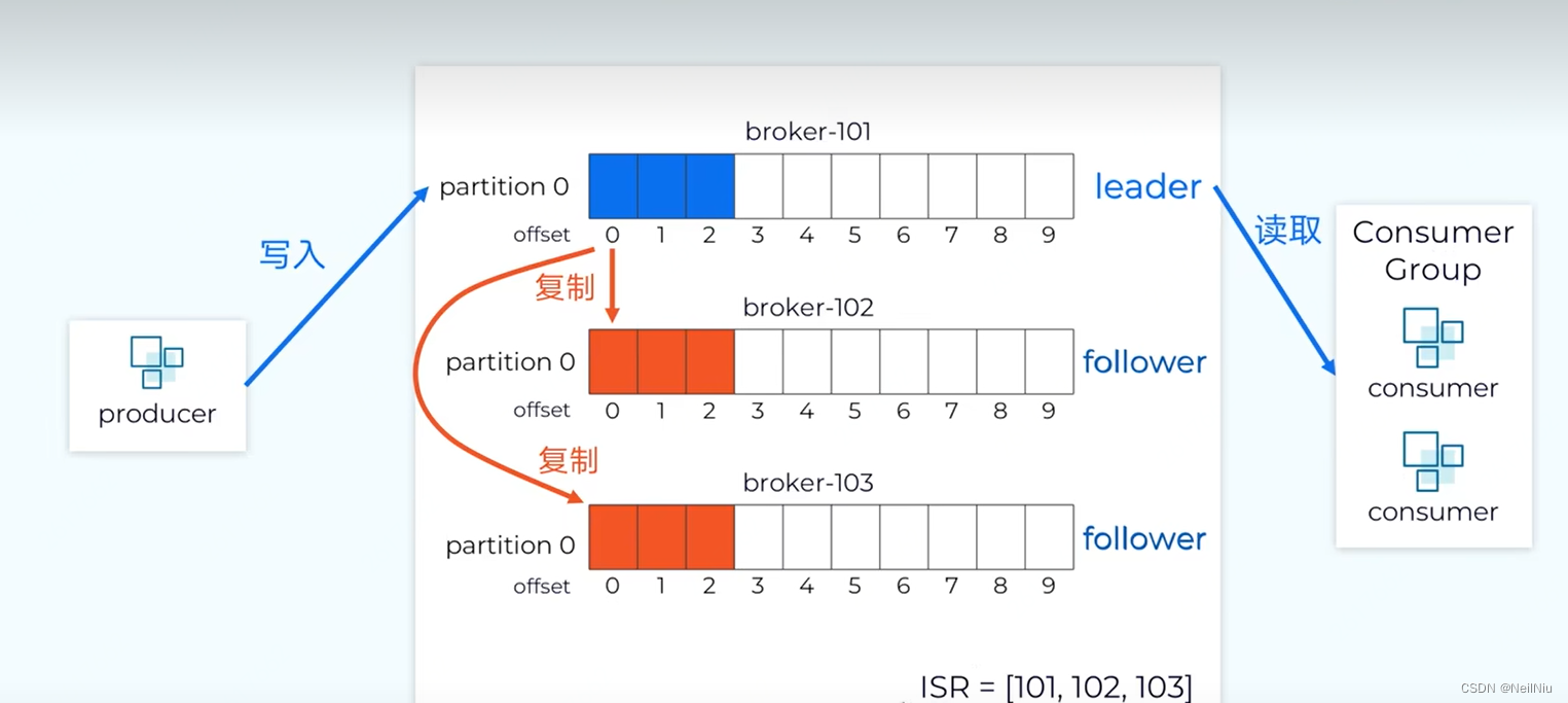 如果分区只存在一份的话,一旦分区损害,这份数据就会丢失,kafka通过副本机制,保证数据的可靠性,可以设置副本因子的数量,replication-factor=3,含义就是包含主分区在内三个副本,kafka会选择一个副本做为主分区,主分区称之为leader,所有写入都是写入到leader中的,数据的读取也是从leader中读取的,其他两个副本称之follower,follower从leader中复制数据,保持数据的一致性,kafka会监控副本之间数据同步的状态,在元数据中维护一个ISR的集合,正在同步的副本集,这个例子中这三个副本保持正常的数据同步,如果某个副本不能正常的同步数据,或者落后的比较多,kafka会从同步的副本集将这个副本剔除,直到这个节点追赶上来之后,再重新加入,ISR=[101,102,103]