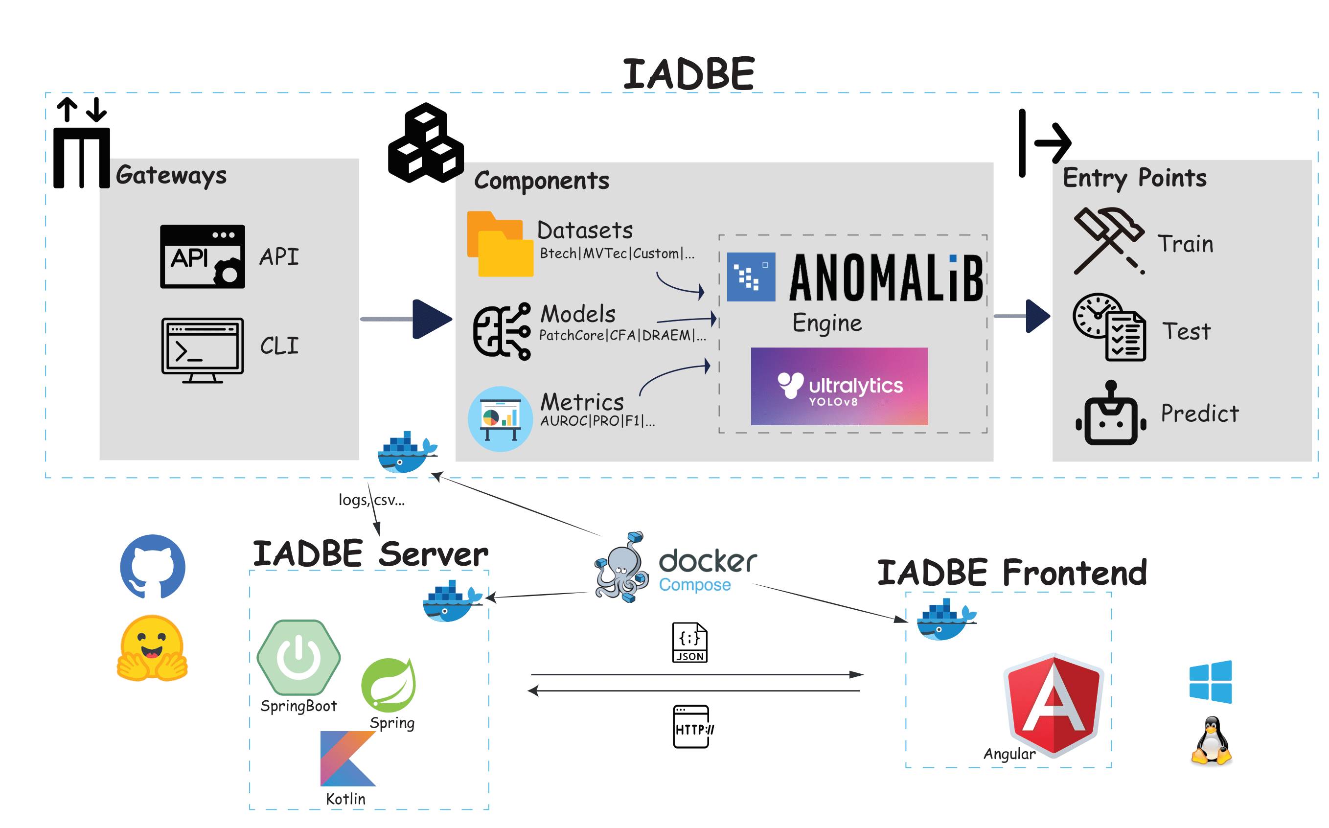 本人高分硕士论文项目:工业异常检测基准引擎 1. 架构如图所示,IADBE(Industrial Anomaly Detection Benchmark Engine)系统由三个主要部分组成: IADBE、IADBE 服务器和 IADBE 后台。IADBE 是系统的核心,API 和 CLI 是网关。数据集、模型和指标是系统最重要的部分。模型基于开源的 Anomalib 和 YOLOv8。系统有三个主要入口: 训练、测试和预测。在 IA...